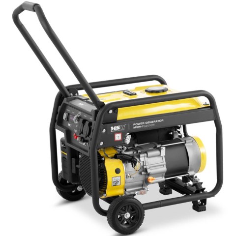 sprawdzi się na placach budowy wszędzie tam, gdzie istnieje problem z dostępnością sieci energetycznej. Wytwarza prąd o napięciu 230 V, nieduży rozmiar zapewnia mu mobilność. Silnik 4-suwowy o mocy 3000 W zasilany jest benzyną. Wyróżnia się wysoką sprawnością energetyczną, zużywa tylko ≤ 395 g/kWh. Silnik o mocy 7 KM można uruchomić ręcznie i jest natychmiast gotowy do użycia dzięki zapłonowi CDI. Urządzenie cechuje się cichym działaniem. Wyświetlacz LED pokazuje parametry pracy. Do agregatu można podłączyć urządzenia o napięciu 230 V AC. Generator posiada regulator napięcia AVR. Trzy połączenia (2 Schuko, 1 CEE) umożliwiają używanie jednocześnie kilku urządzeń końcowych. Bezpieczna pracę zapewniają zabezpieczenia przeciwzwarciowe i przeciążeniowe.