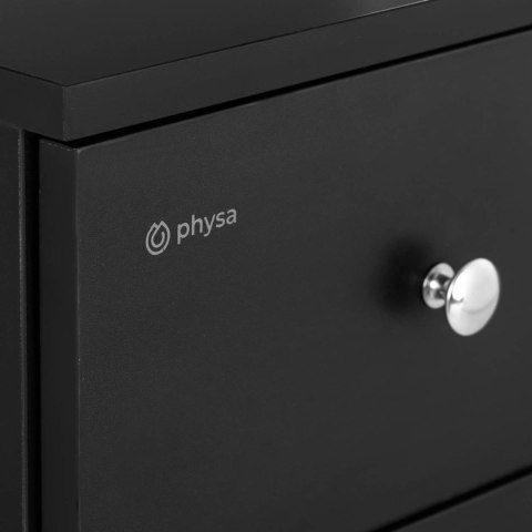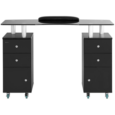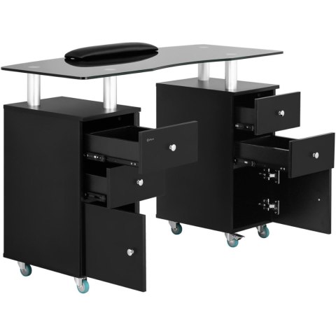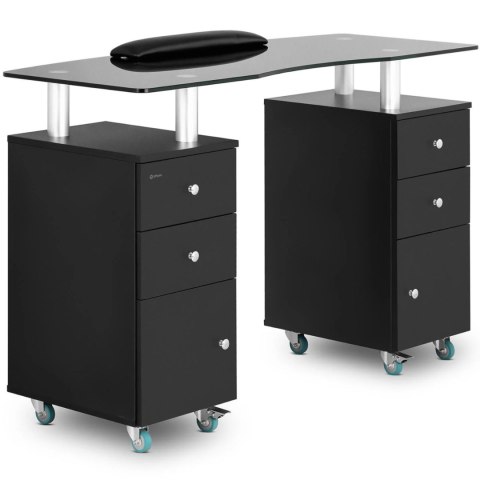 Biurko do manicure marki Physa pozwala stylizować paznokcie, malować je lub nakładać ozdoby. Dobrze przemyślane dodatki i stylowy wygląd biurka kosmetycznego przekonują zarówno pod względem estetycznym, jak i praktycznym. Podpórka pod nadgarstki zapewnia najwyższy komfort podczas wykonywania zabiegu. Blat stołu ma wymiary 120 x 51,5 cm. Biurko posiada atrakcyjny wygląd za sprawą czarnej kolorystyki, szklanego blatu oraz aluminiowych kolumn. 4 szuflady, szafki i półki pomieszczą wszystkie potrzebne akcesoria. Osiem kółek z gumy (w tym dwa z hamulcami) umożliwia łatwe przesuwanie mebla. Wysoka jakość wykonania i trwałe materiały sprawiają, że biurko do paznokci sprosta wszelkim wyzwaniom.