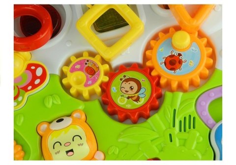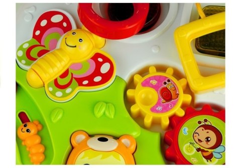 Kolorowy panel edukacyjny znajdujący się w przedniej części chodzika jest odpinany, co pozwala na zabawę w łóżeczku lub podróży bez konieczności używania reszty sprzętu. Co skrywa w sobie ten interaktywny pulpit?