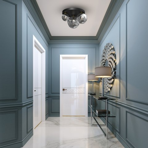 Lampa sufitowa, w ofercie z kloszami w różnych rozmiarach zaczynając od średnicy 140mm i dochodzące do nawet 170mm. Lampy mają mocno zamkniętą konstrukcję, dlatego bardzo skupiają światło i są lampami stricte punktowymi. Lampa wyposażona jest w gniazdo E14. Jest to lampa w stylu glamour, która w wersji 3-punktowej doskonale sprawdzi się nad stołem w jadalni. Mocowanie dymionych kul ma akcent złotawy, co przełamuje szare i srebrne tony dominujące w kolorystyce lampy. Lampa sufitowa z kloszami w rozmiarze 140mm + 200mm + 250mm sprawdzi się w różnego rodzaju pomieszczeniach. To klasyczny wzór, który najciekawiej może komponować się z jasnymi wnętrzami łazienek. Lampa jest utrzymana w stylu glamour, pasuje do wnętrz klasycznych, ale z nutą nowoczesności. Będzie dobrze oświetlała małe pomieszczenia łazienek i toalet, jednocześnie nadając im przytulności i niepowtarzalnego stylu. Stylowa mieszanka różnych materiałów łączy się w harmonijną całość, która sprawia, że lampa przyciąga wzrok nawet wtedy, gdy jest wyłączona.