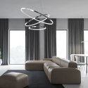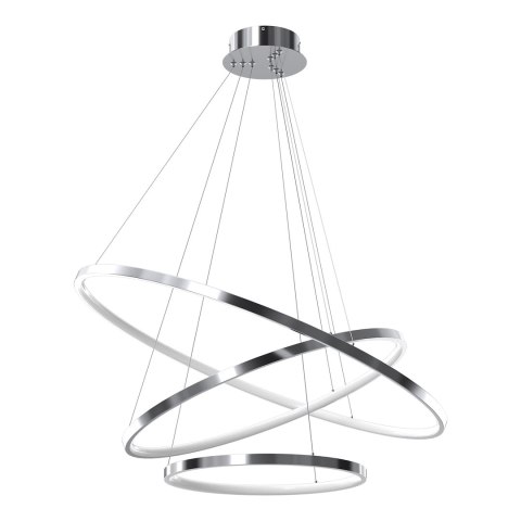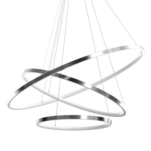 Lampa wisząca HOOP 93W posiada trzy źródła światła zamontowana w okrągłych oprawach o średnicy: 40 cm, 60 cm i 80 cm. Zainstalowano w nich wymienne moduły LED o łącznej mocy 93W LED. Zaletą lampy jest możliwość dowolnej regulacji wysokości opraw od 50 do 90cm. Takie rozwiązanie pozwala na dopasowanie jej do pomieszczeń zarówno wysokich, jak i niskich. Barwę oświetlenia dobrano w taki sposób, aby lampa gwarantowała jak największy komfort jej użytkowania, stąd barwa neutralna 4000K. Lampa HOOP wyróżnia się trzema okrągłymi oprawami, wykończonymi w chromowym kolorze. Całość zaprojektowana w prostej, a zarazem oryginalnej stylistyce. Niezwykle estetyczna forma sprawia, że lampa będzie doskonałym uzupełnieniem stylowych, minimalistycznych wnętrz. Idealnie sprawdzi się jako część wystroju salonu, jadalni i pokoju gościnnego.