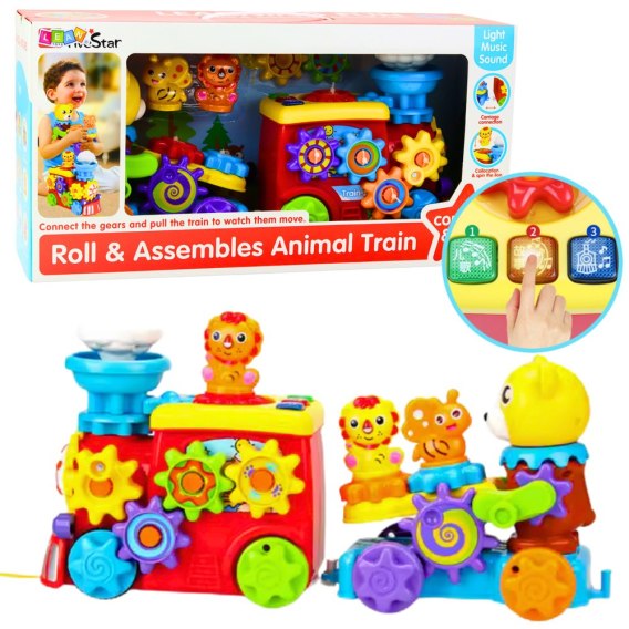 Zabawka została wyposażona w obracające się koła zębate, które angażują rączki dziecka i pomagają w rozwijaniu precyzyjnych ruchów. Dodatkowo obecne są efekty świetlne i dźwiękowe, które pobudzają zmysły i wprowadzają malucha w świat pierwszych bodźców audiowizualnych. W centralnej części pociągu znajduje się unosząca się i opadająca chmurka, a z przodu przyczepki - poruszająca się pszczółka, która aktywuje się po zakręceniu specjalną korbką przy misiu. Takie mechaniczne rozwiązania uczą dziecko zależności przyczynowo-skutkowych i zachęcają do samodzielnego odkrywania.