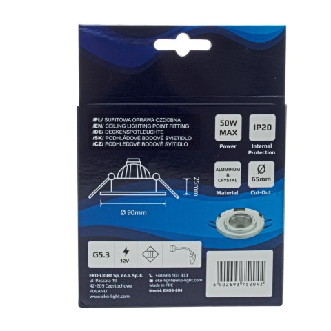 Oczko sufitowe szklane OKRĄGŁE. Kolor: SREBRNY . Nowość w gamie Firmy Eko-Light, doskanale wykończone oczka szklane, które ozdobią każdą powierzchnie . Przy pomocy tego asortymentu możemy oświetlić/doświetlić każde pomieszczenie, w którym zarówno ściany jak i sufit został wykonany z płyt osb lub z płyt kartonowo-gipsowych. Główną zaletą tego produktu jest prostota i duża funkcjonalność . Oczko wykonane jest z materiałów najwyższej jakości . Powłoka któą został pokryty produkt jest trwały, dzięki czemu zainstalowany asortyment w Państwa domu, będzie słóżył przez wiele lat. Do oprawy należy dokupić odpowiednią żarówkę o symbolu Gu10, oraz oprawkę ceramiczną, dzięki której będziemy mogli zasilić żarówkę napięciem 230V . Może to być żarówka GU10 przystosowana do napięcia 230V. Cały asortyment potrzebny do zainstalowania oprawy kupią Państwo na naszej platformie internetowej ( b2b.eko-light.com )