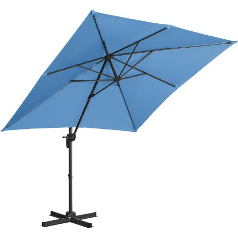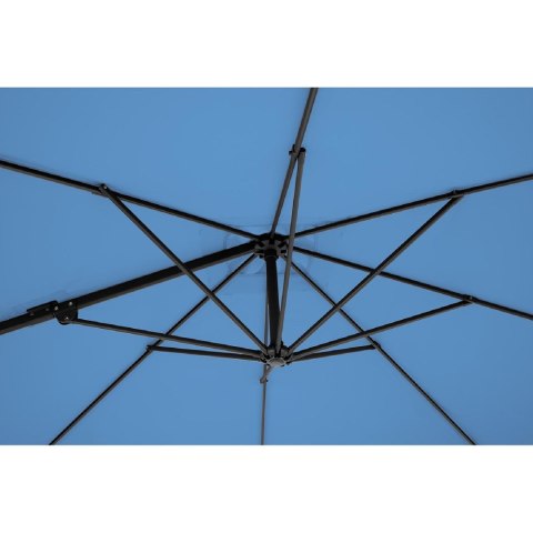 Parasol posiada boczną konstrukcję. Zadaszenie o wymiarach 250 x 250 cm zapewnia optymalny cień, czaszę można odchylić pod dowolnym kątem oraz dzięki specjalnemu mechanizmowi obrócić o 360°. Za pomocą korby można go szybko rozłożyć i złożyć. Wytrzymały poliester, którym pokryto stalowe żebra ma gęstość 180g/m2 i jest odporny na uszkodzenia mechaniczne. Zadaszenie opiera się na stabilnej stalowej konstrukcji o średnicy 5,7 cm przystosowanej do różnych warunków atmosferycznych, odpornej na korozję i uszkodzenia mechaniczne. Drążek z lekkiego aluminium nie złamie się ani nie wygnie nawet przy wietrznej pogodzie. Podstawa krzyżowa posiada otwory na śruby, można ją zamocować do podłoża. Dla uzyskania jeszcze lepszej stabilności można dokupić specjalną podstawę, która dodatkowo przytrzyma całość na miejscu. Parasol jest odporny na działanie promieni UV, zapewnia najwyższą ochronę przeciwsłoneczną na poziomie 98%. Posiada powłokę UPF 50+ potwierdzoną przez badania przeprowadzone przez Instytut Włókien Naturalnych i Roślin Zielarskich.