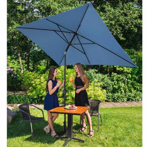zapewnia odpowiednią ilość cienia i ochronę prze promieniami UV podczas letniego wypoczynku na tarasie czy w ogrodzie. Duży rozmiar 200 x 300 cm skutecznie chroni przed słońcem. Pokrycie parasola wykonane zostało z poliestru o gęstości 180 g/m2. Tkanina ta jest odporna na rozciąganie, rozdarcia i promieniowanie UV oraz jest łatwa w czyszczeniu. Współczynnik ochrony UPF 50+ chroni przed 98% promieni słonecznych. Słupek posiada średnicę 38 mm i wykonany został wraz z aluminium. Żebra wykonano ze stali. Szczyt czaszy posiada specjalny wywietrznik, który zapewnia lepszą cyrkulację powietrza i chroni przed przewróceniem w wietrzne dni. Parasol można ustawić w samej podstawie (brak w zestawie) lub włożyć do otworu w stole ogrodowym.