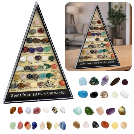 Przezroczysta obudowa chroni kamienie przed uszkodzeniem oraz kurzem, jednocześnie umożliwiając wygodne oglądanie całej kolekcji. Kompaktowy rozmiar sprawia, że zestaw można ustawić na biurku, półce, w szkolnej pracowni lub gabinecie. Kolekcja minerałów doskonale sprawdzi się jako pomoc edukacyjna, element dekoracyjny lub wyjątkowy prezent dla osób zainteresowanych geologią i światem przyrody.